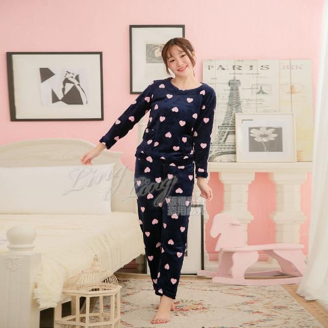 lingling全尺碼-粉嫩心型水貂絨長袖二件式睡衣組 居家服成套睡衣(PA3851-神秘深藍)