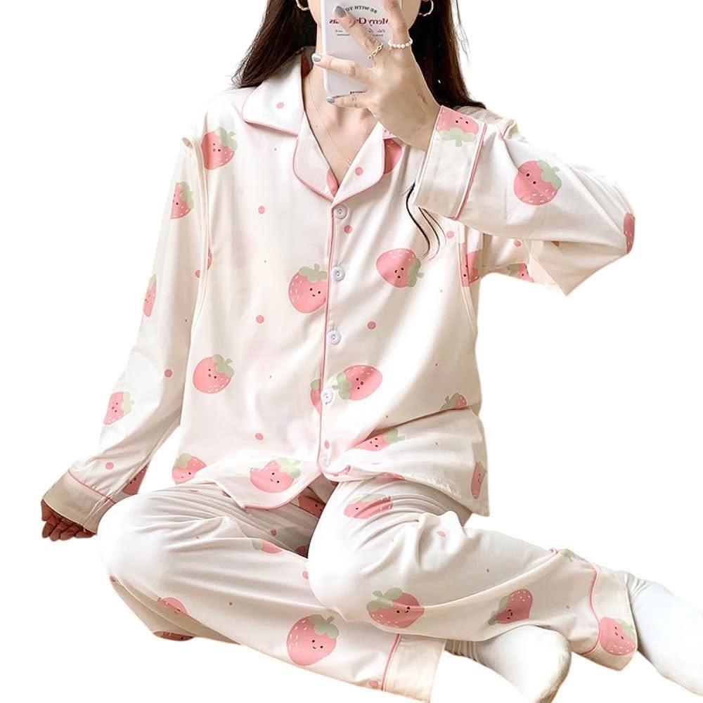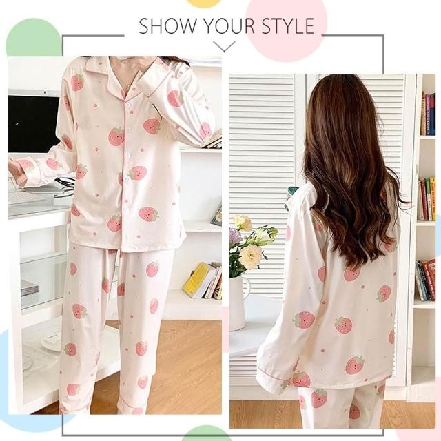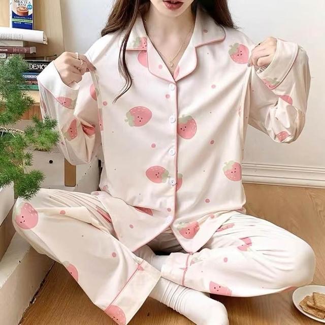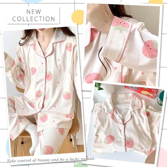 lingling全尺碼-笑臉草莓側掀哺乳衣牛奶絲長袖二件式睡衣組 孕婦睡衣居家服(PA4396-米白草莓)
