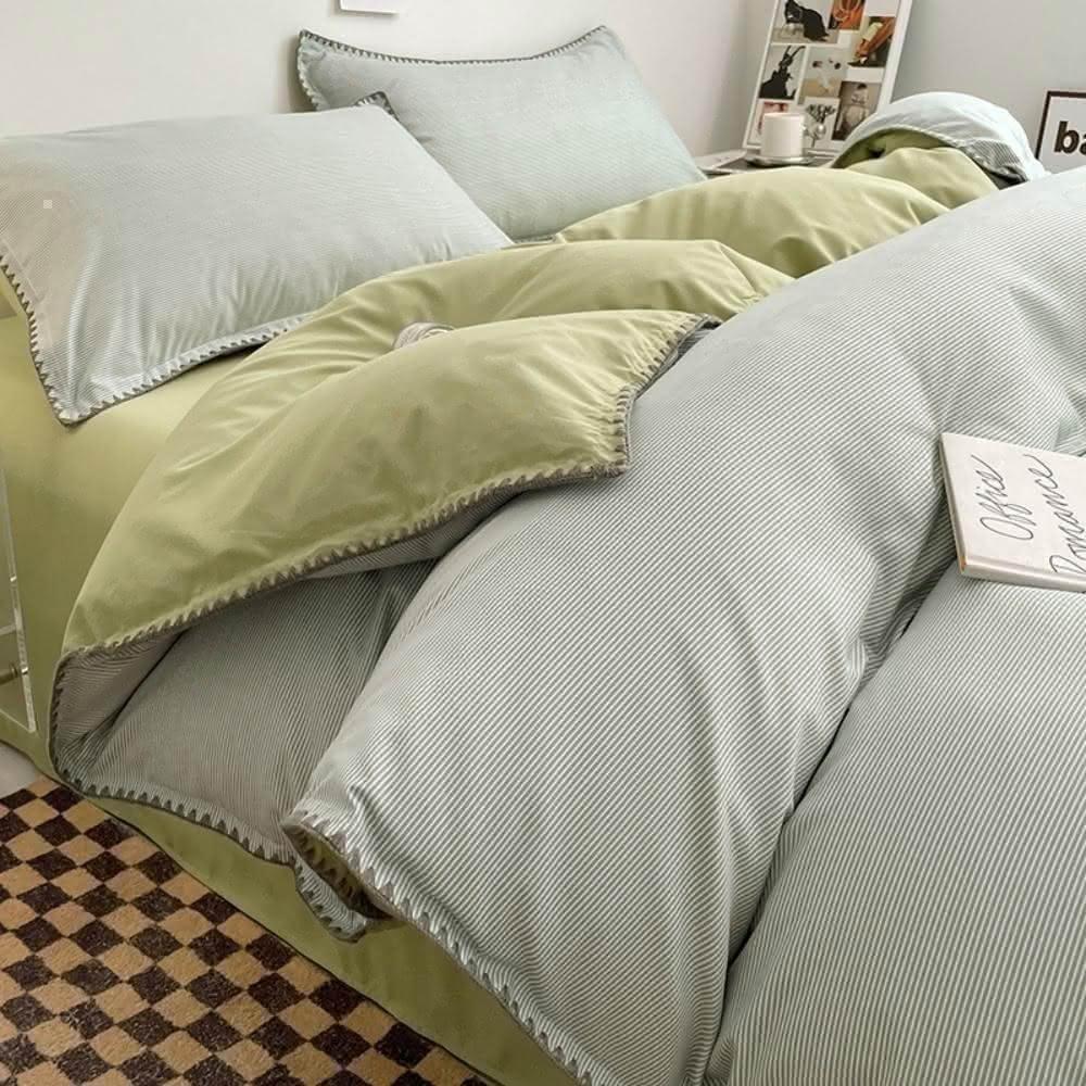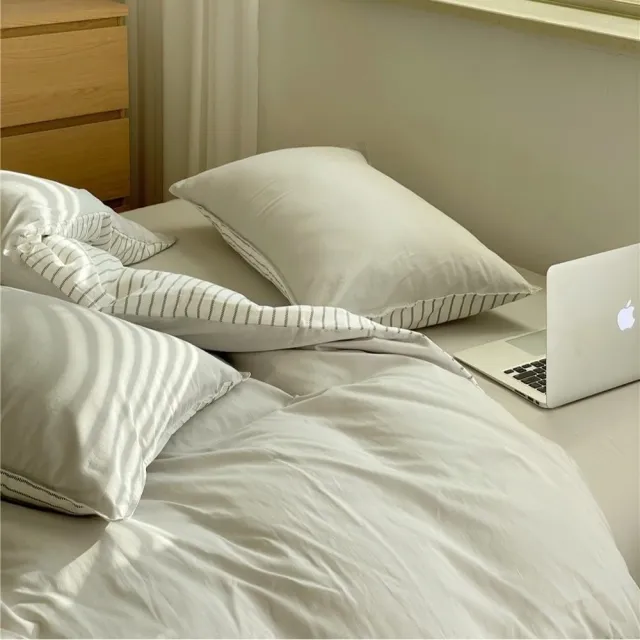 Arvo Home 蒔桄家居無印風條紋被套床包三件/四件組-單人/雙人/加大(四季被套 裸睡床包 水洗棉被套 奶油細條紋床組 日系床包 雲朵被套)
