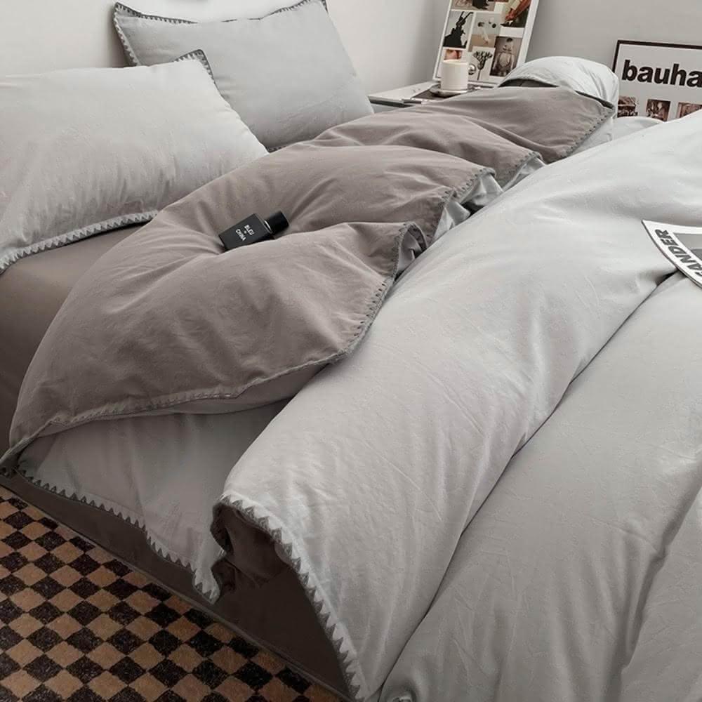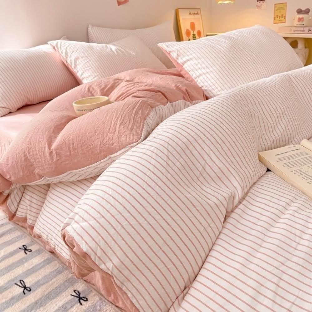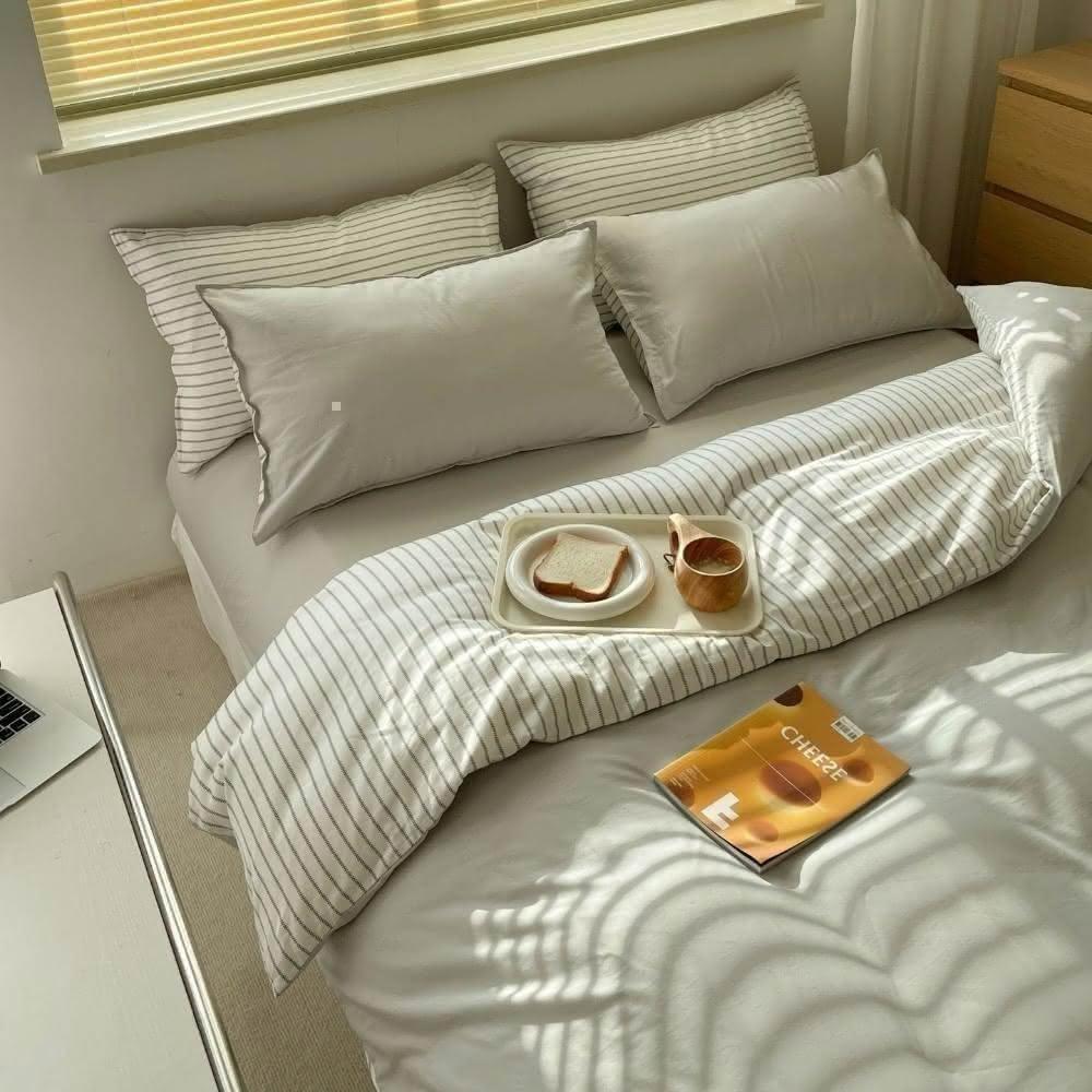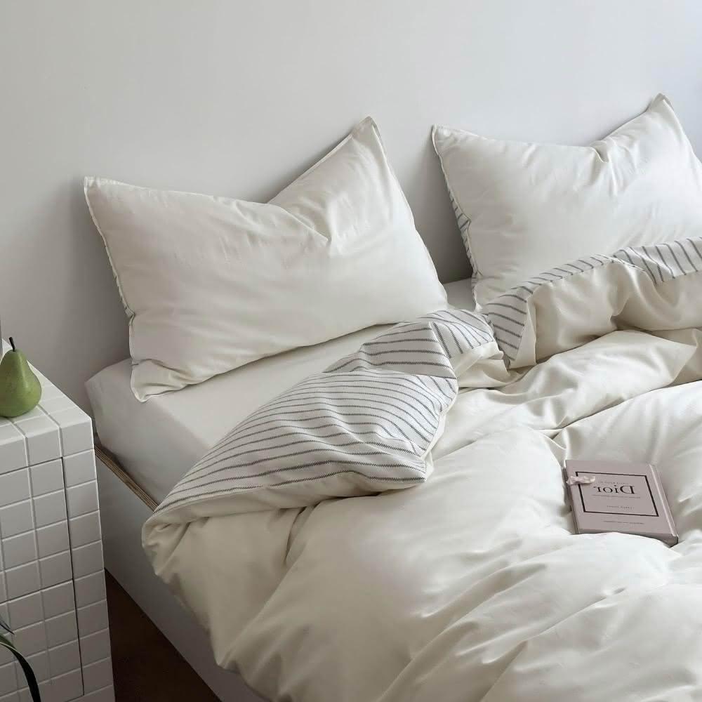 Arvo Home 蒔桄家居無印風條紋被套床包三件/四件組-單人/雙人/加大(四季被套 裸睡床包 水洗棉被套 奶油細條紋床組 日系床包 雲朵被套)
