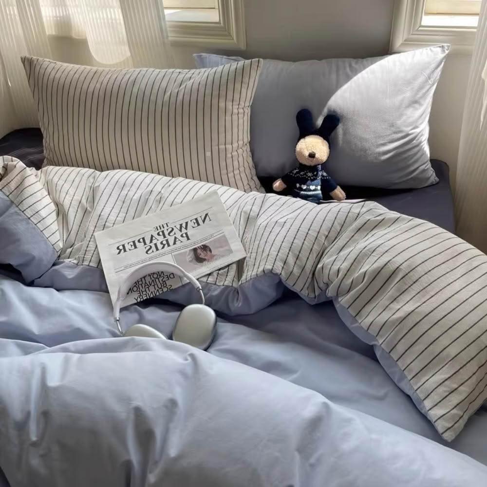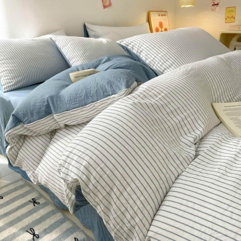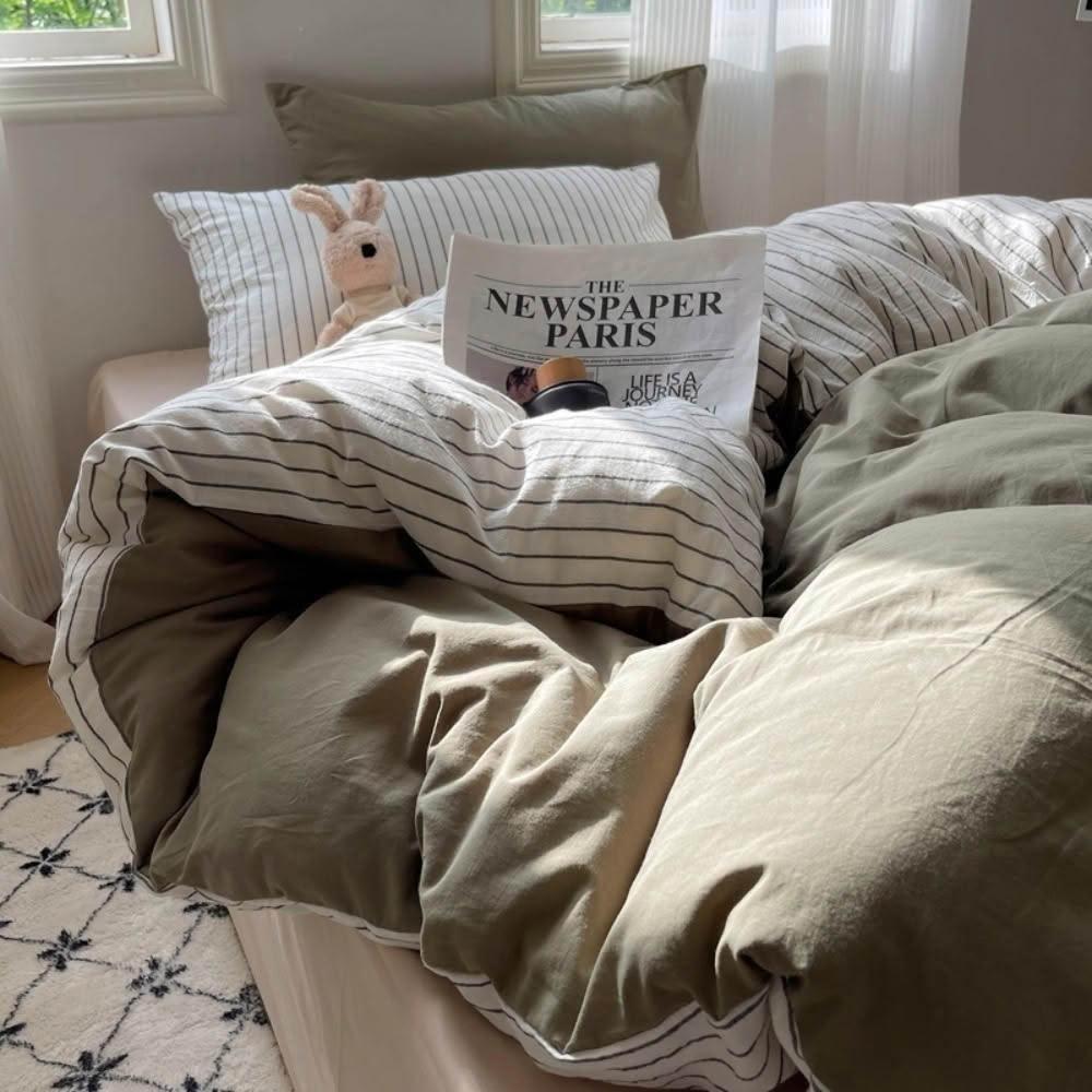 Arvo Home 蒔桄家居無印風條紋被套床包三件/四件組-單人/雙人/加大(四季被套 裸睡床包 水洗棉被套 奶油細條紋床組 日系床包 雲朵被套)
