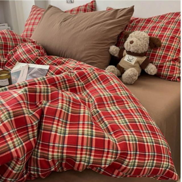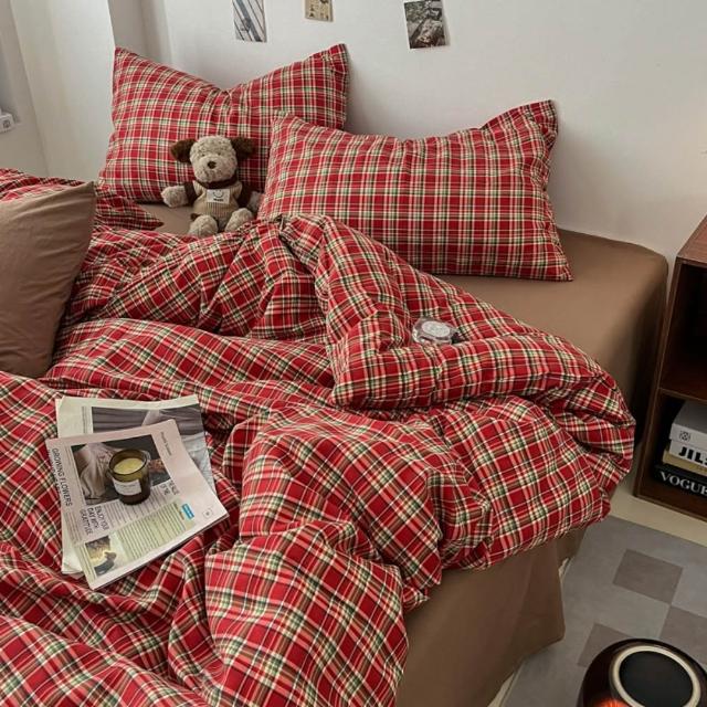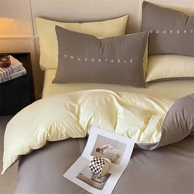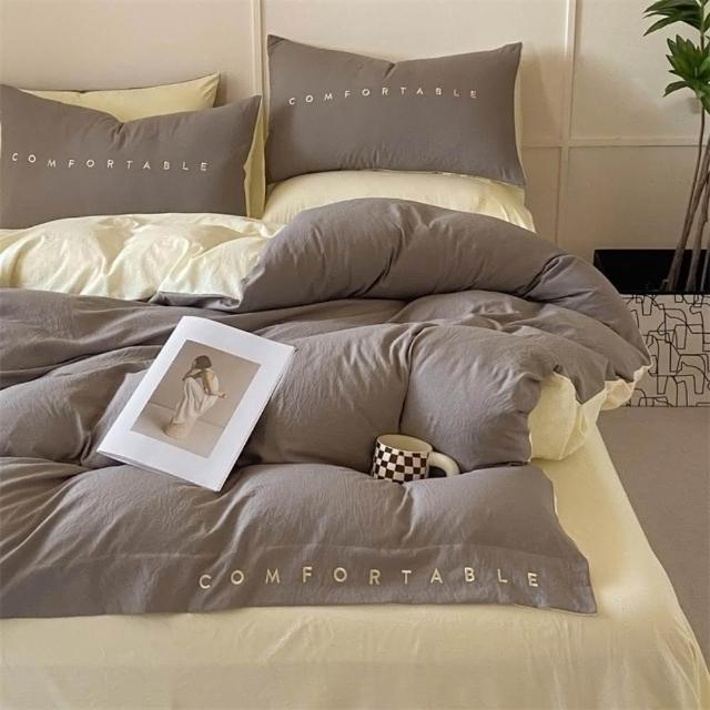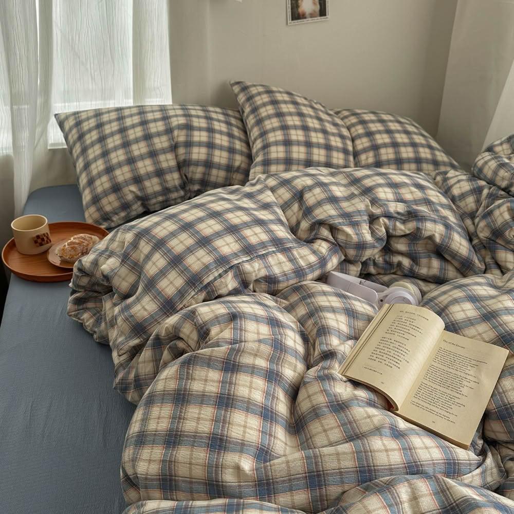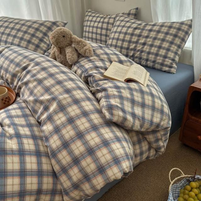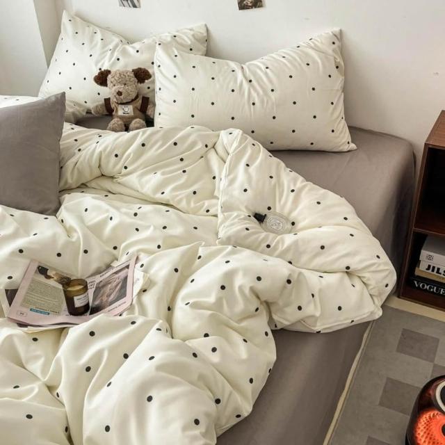 Arvo Home 蒔桄家居北歐暖茶格被套床包組(雙人/加大床包組 裸床包 小圓點被套 英文字刺繡寢具 裸睡床單 質感床包)