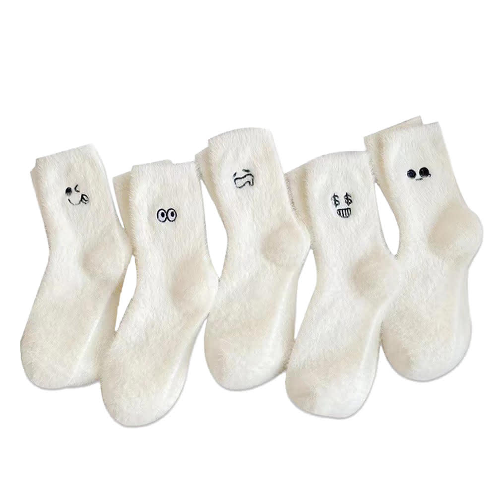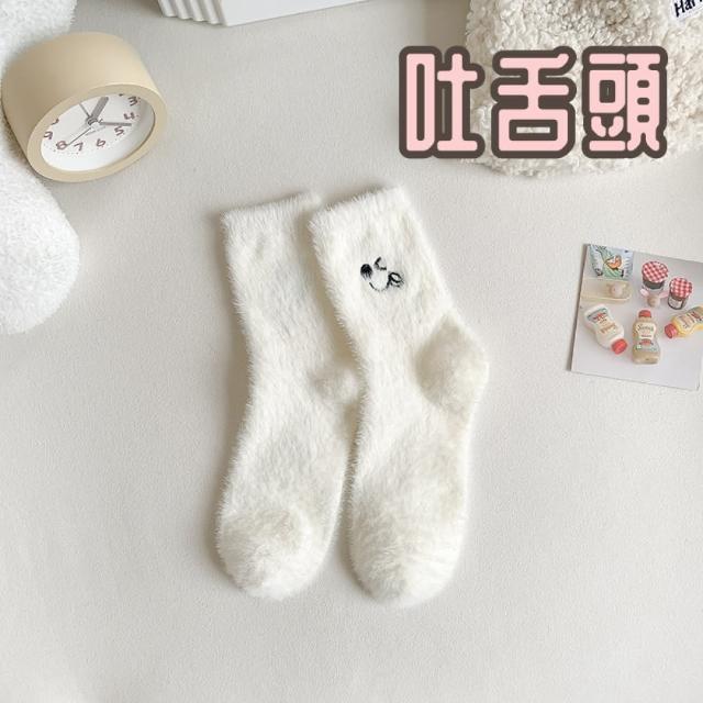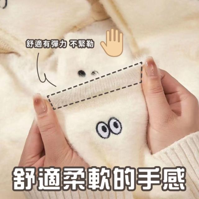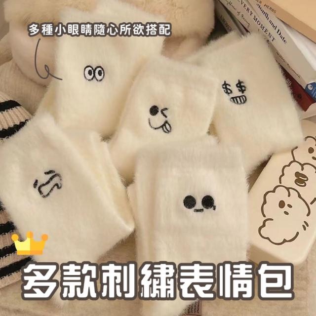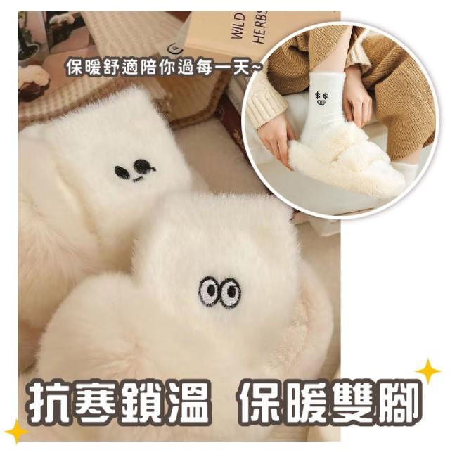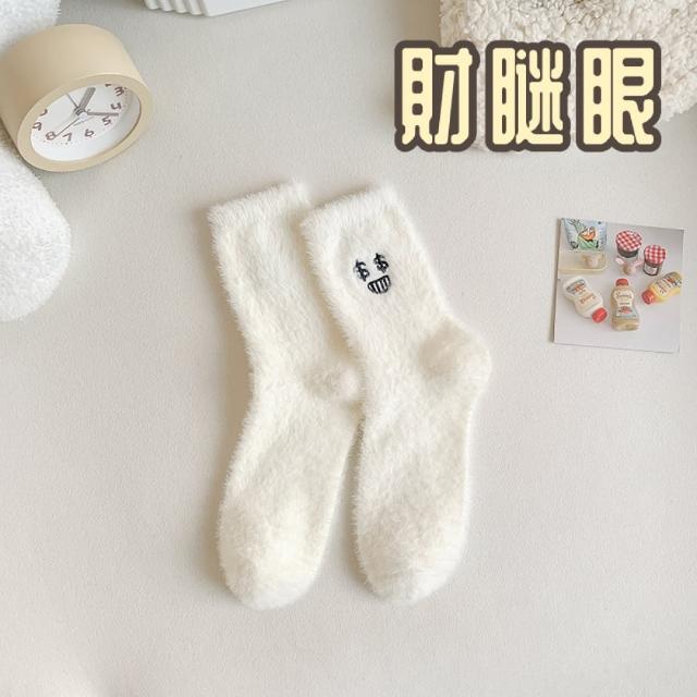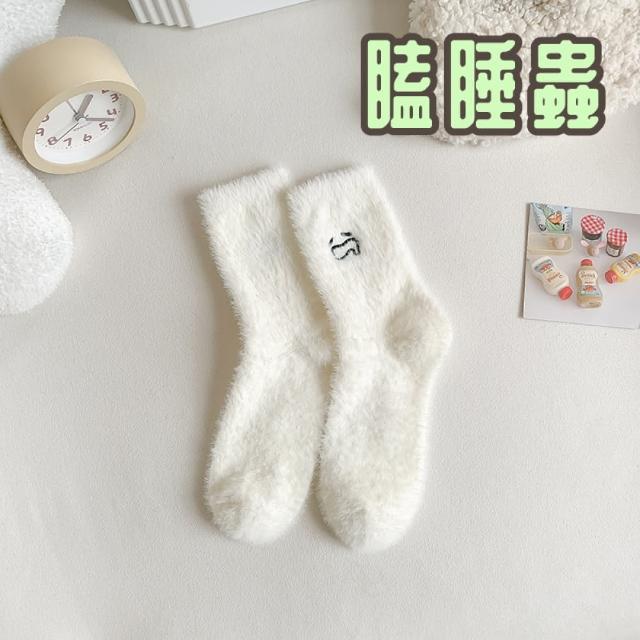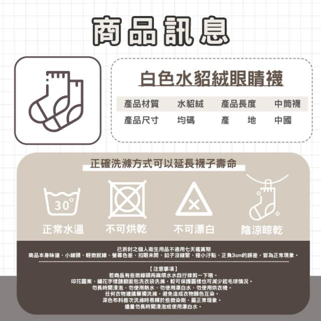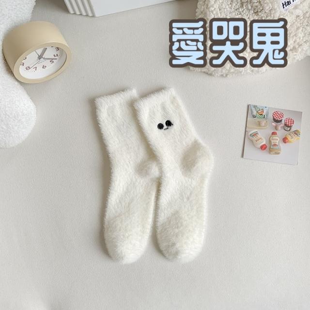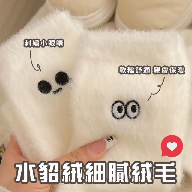 HONG JIN白色水貂絨眼睛襪(可愛 居家 珊瑚絨 中筒襪 日系 刺繡)