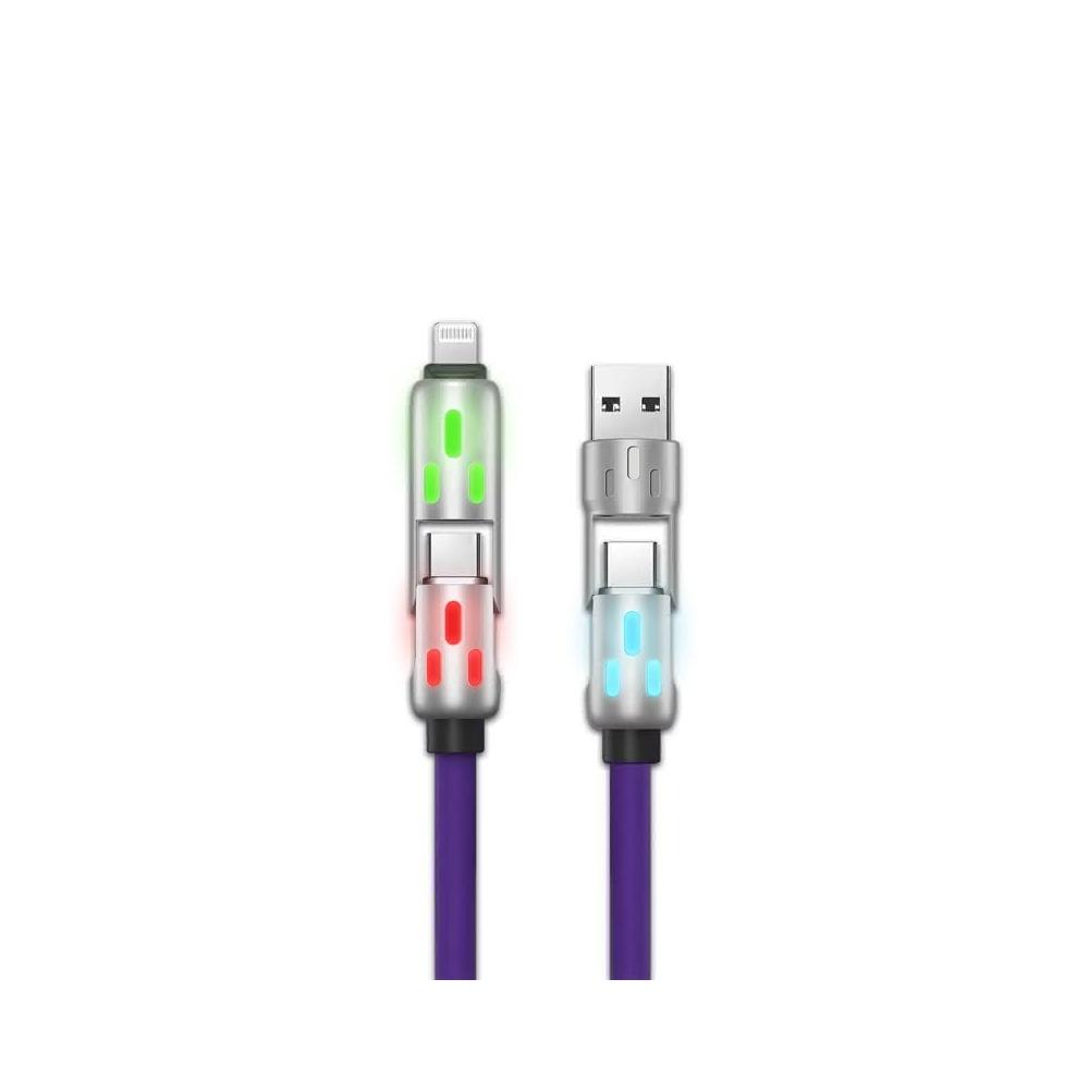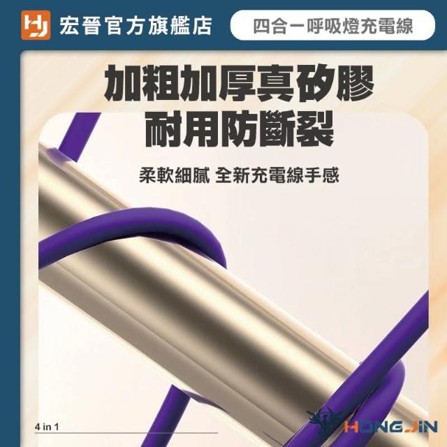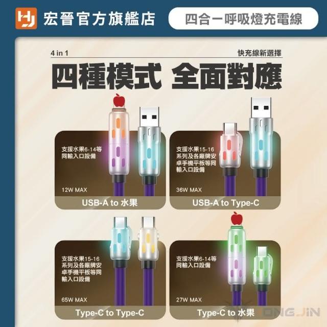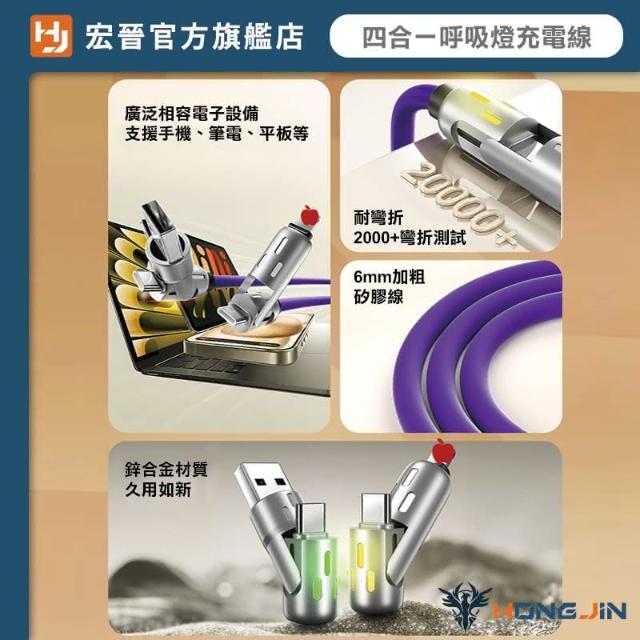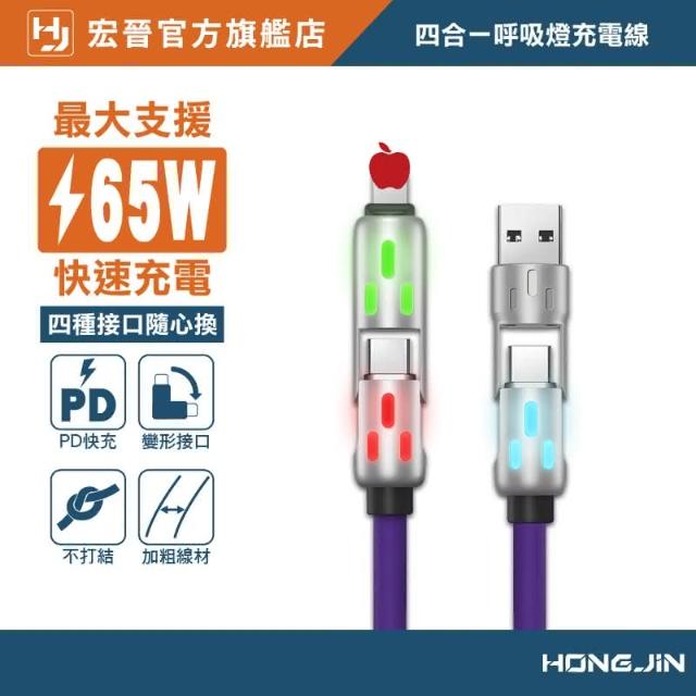 HONG JIN炫彩呼吸燈 四合一快充線 充電線 液態矽膠PD快充線 充電線 PD 65W 水果 Type-C 鋅合金 手機快充線