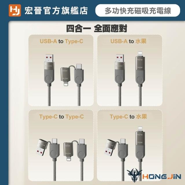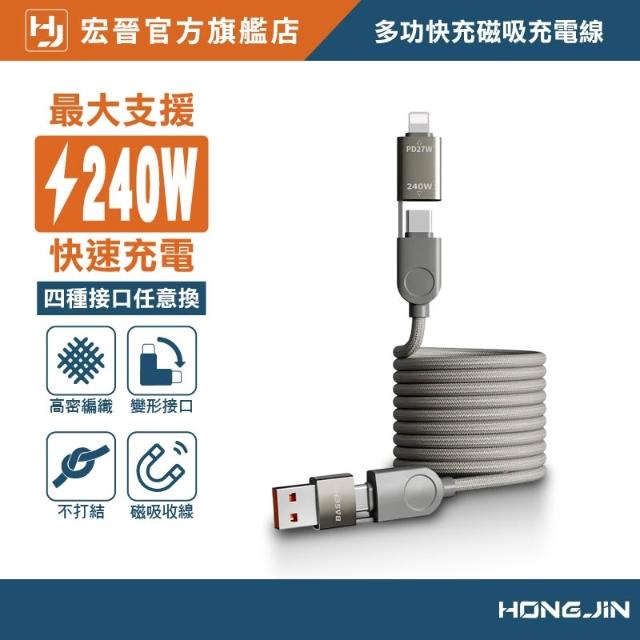 HONG JIN多功快充磁吸充電線 四合一 編織 快充線 一線搞定 不挑設備 鋅合金 最大支援240W 支援PD 線身磁吸收納 不打結