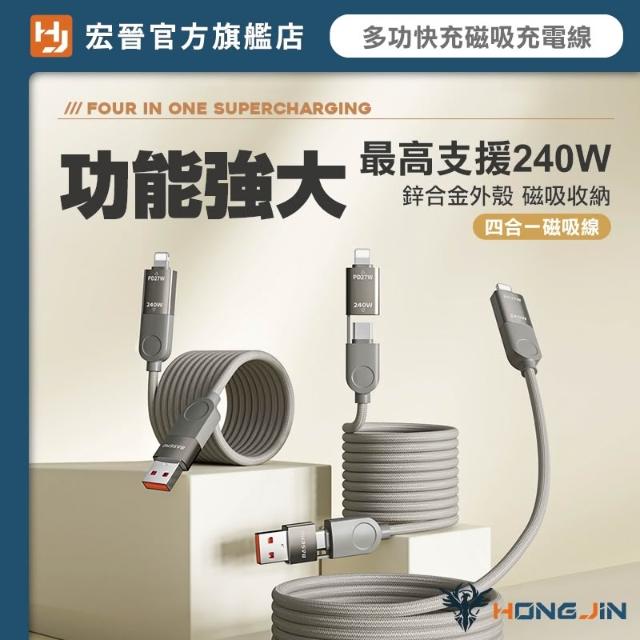 HONG JIN多功快充磁吸充電線 四合一 編織 快充線 一線搞定 不挑設備 鋅合金 最大支援240W 支援PD 線身磁吸收納 不打結