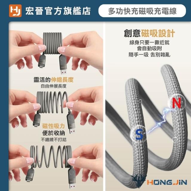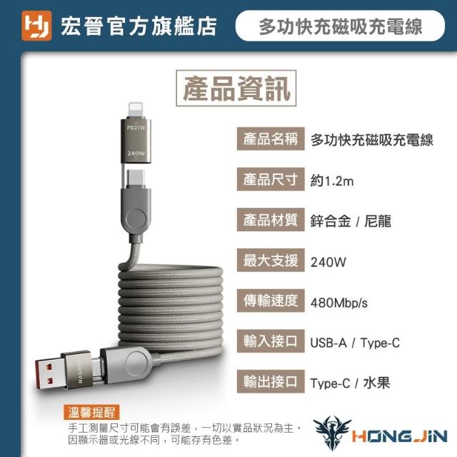 HONG JIN多功快充磁吸充電線 四合一 編織 快充線 一線搞定 不挑設備 鋅合金 最大支援240W 支援PD 線身磁吸收納 不打結