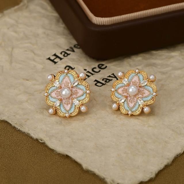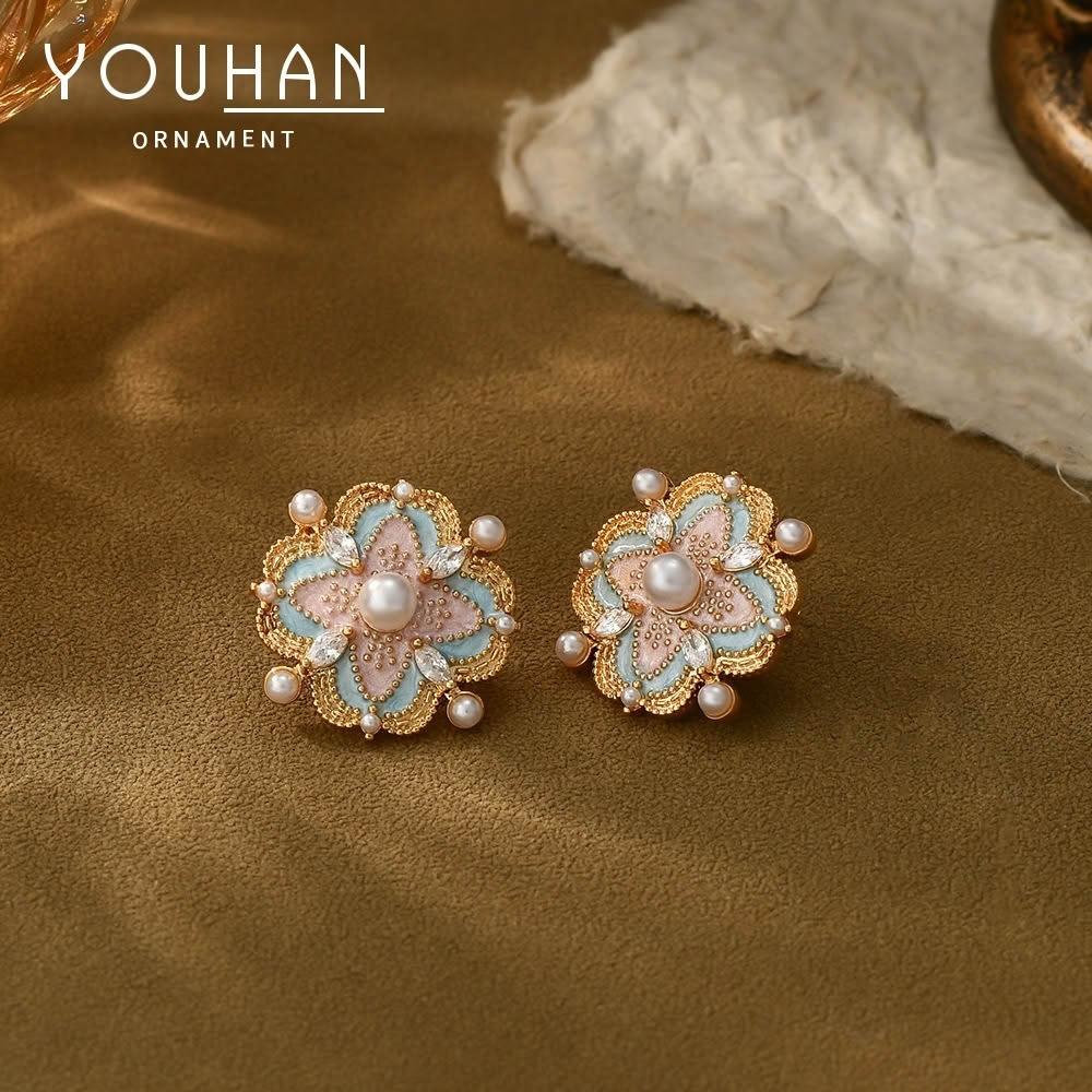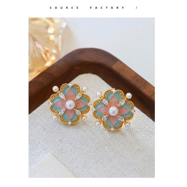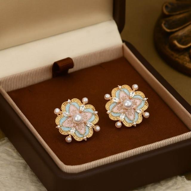 iss Si【現貨速發S925銀針復古法式珍珠耳釘女高級感琺瑯滴油花瓣耳環 滴釉鑲鑽花朵 民俗風中式 高級輕奢華麗感