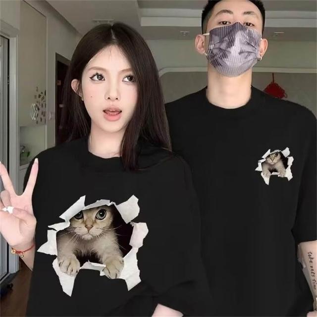 B1 地下室情侶裝 日系趣味貓咪破牆印刷短袖T恤 寬鬆 五分袖 男生衣服 短袖上衣 大尺碼5XL NL624137 (情侶 日系 )