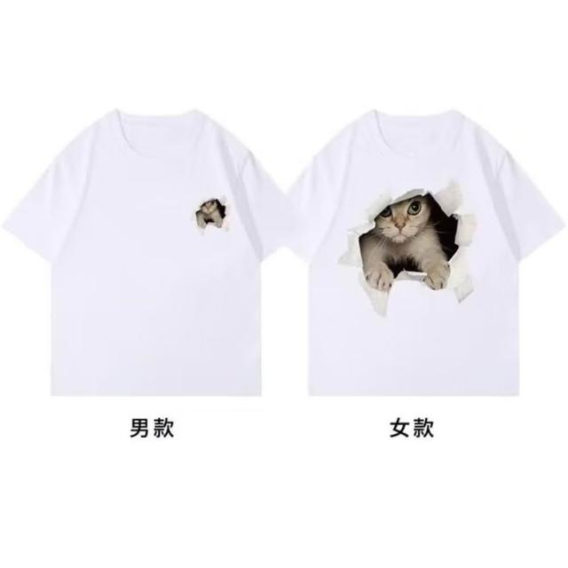 B1 地下室情侶裝 日系趣味貓咪破牆印刷短袖T恤 寬鬆 五分袖 男生衣服 短袖上衣 大尺碼5XL NL624137 (情侶 日系 )