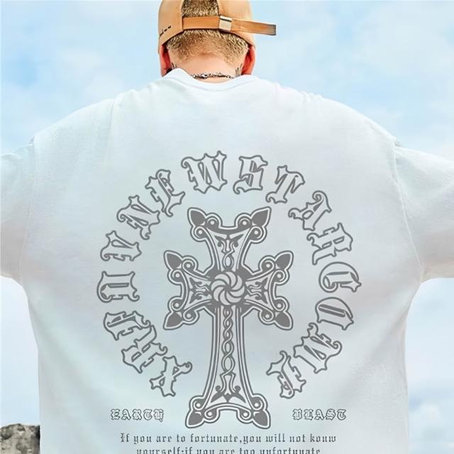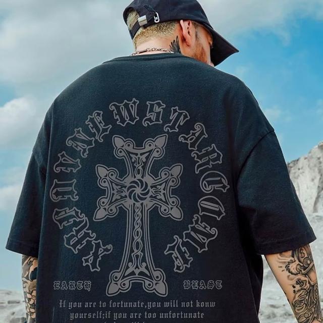 B1 地下室短袖 美式十字架圖騰短T t恤 男生衣服 街頭 男裝 五分袖 大尺碼8XL男裝 NL623230(男短T 暗黑 潮流 十字架 短袖上衣 大尺碼)