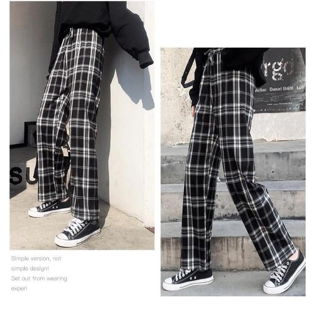 褲子 台灣現貨 韓版 格子褲 格紋褲 百搭款 休閒長褲 直筒褲 女生褲子 黑白格紋 寬褲 高腰顯腿長 顯瘦 格紋長褲