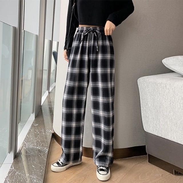 褲子 台灣現貨 韓版 格子褲 格紋褲 百搭款 休閒長褲 直筒褲 女生褲子 黑白格紋 寬褲 高腰顯腿長 顯瘦 格紋長褲