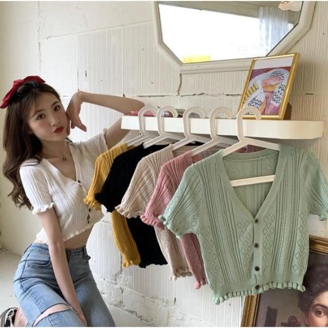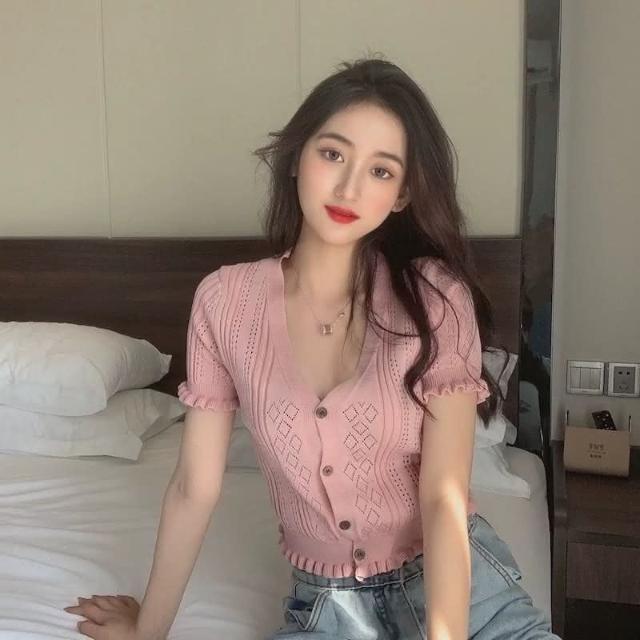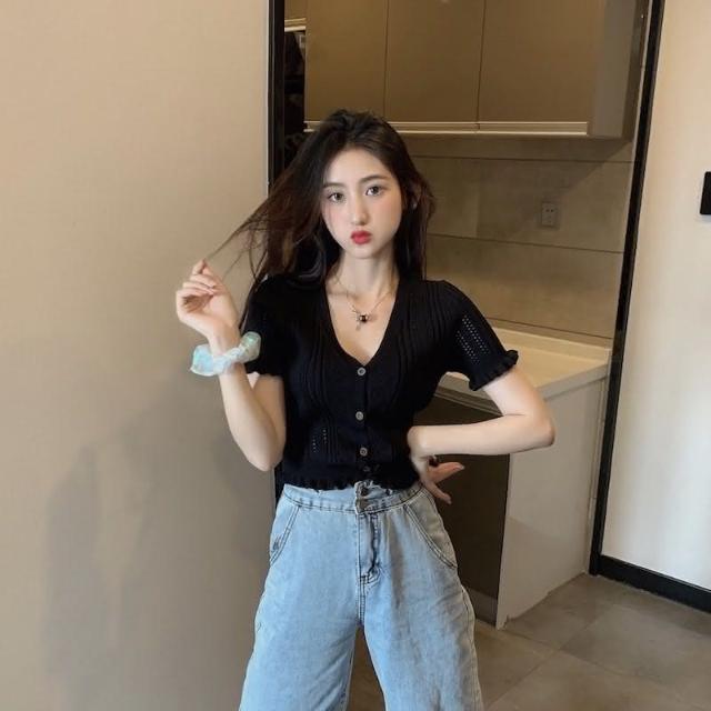 短袖 臺灣現貨 顯瘦鎖骨款 V領排扣上衣 短版上衣 V領針織短袖上衣 短袖t恤 女裝 顯瘦上衣 衣服