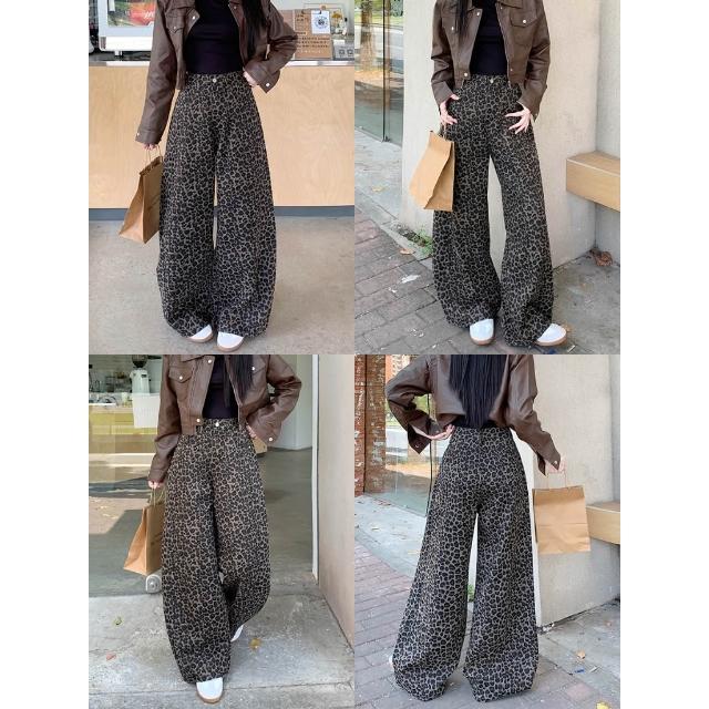 現貨 豹紋褲 牛仔長褲 豹紋 長褲 美式 復古 括腿褲 牛仔褲 小個子 水洗 高腰 寬鬆 彎刀褲 顯瘦