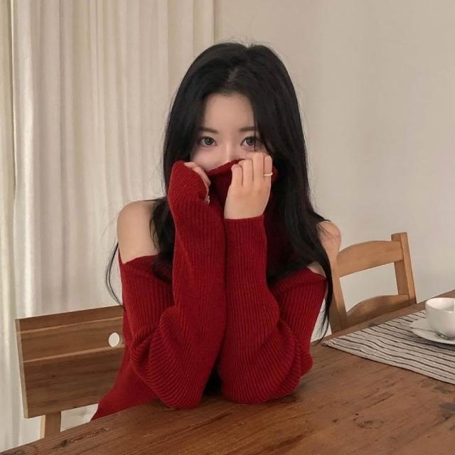 高領露肩針織毛衣 紅色毛衣 黑色毛衣 氣質 韓系穿搭 高領毛衣 冬天女裝 過年穿