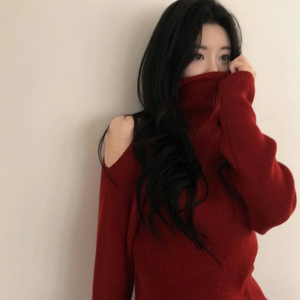 高領露肩針織毛衣 紅色毛衣 黑色毛衣 氣質 韓系穿搭 高領毛衣 冬天女裝 過年穿