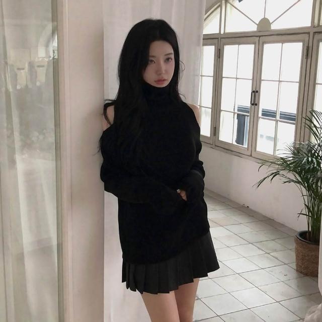 高領露肩針織毛衣 紅色毛衣 黑色毛衣 氣質 韓系穿搭 高領毛衣 冬天女裝 過年穿