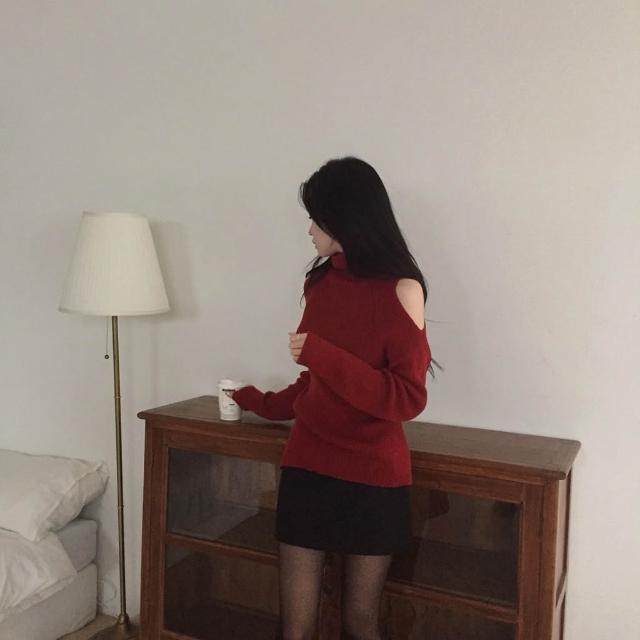 高領露肩針織毛衣 紅色毛衣 黑色毛衣 氣質 韓系穿搭 高領毛衣 冬天女裝 過年穿