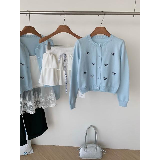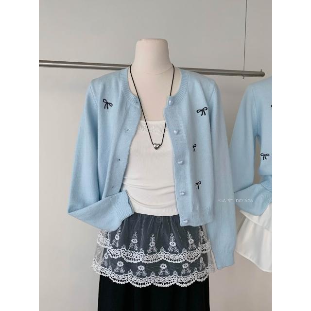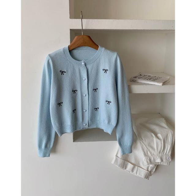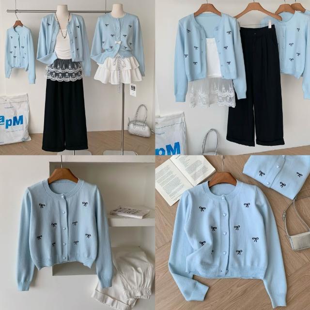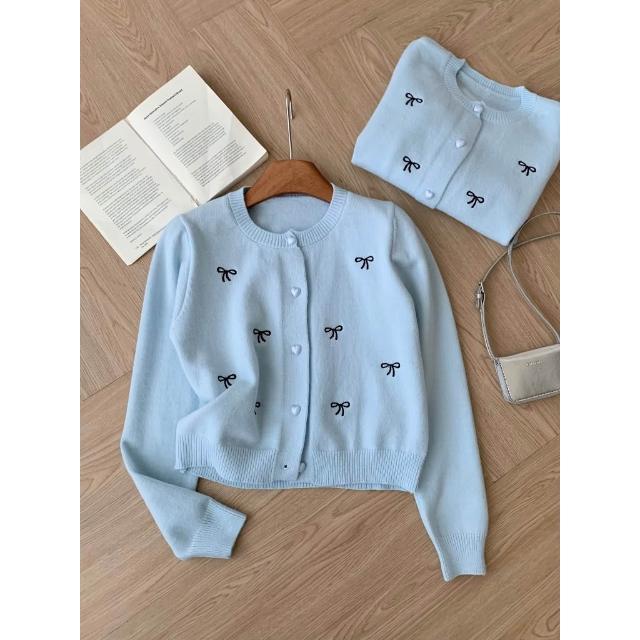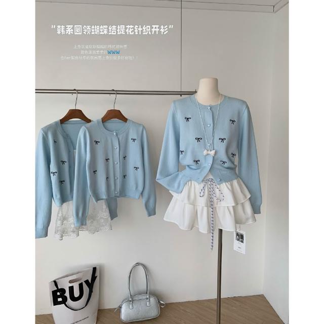 現貨 蝴蝶結針織外套 韓系氣質開襟針織上衣 霜藍 甜美蝴蝶結提花外套 女生長袖毛衣外套 冬季百搭針織衫