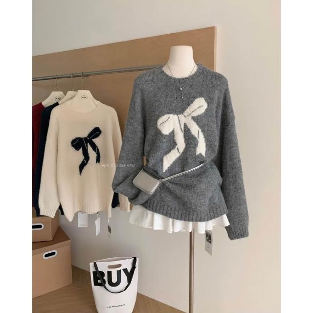 太妮絲HU16 現貨 韓系 紅色毛衣 蝴蝶結針織毛衣 慵懶風針織上衣 女生冬季毛衣 甜美氣質蝴蝶結毛衣 長袖 針織衫