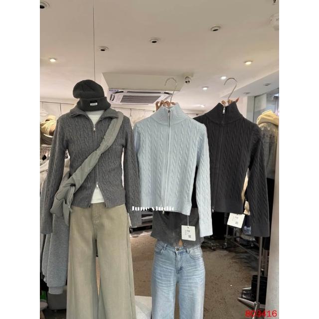 韓系 麻花半高領拉鍊針織外套 針織上衣 毛衣外套 雙拉鍊設計 保暖翻領針織衫 POLO領 針織外套