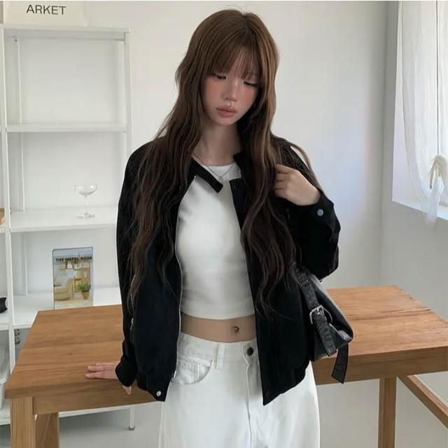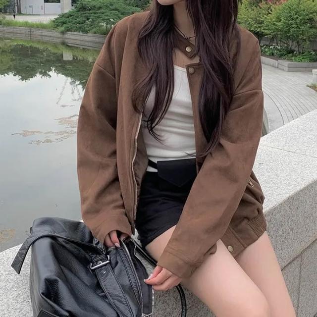 韓系休閒風 麂皮 外套 女生秋冬翻領夾克 寬鬆顯瘦外套 百搭短版麂皮夾克 棕色外套 韓妞 外套