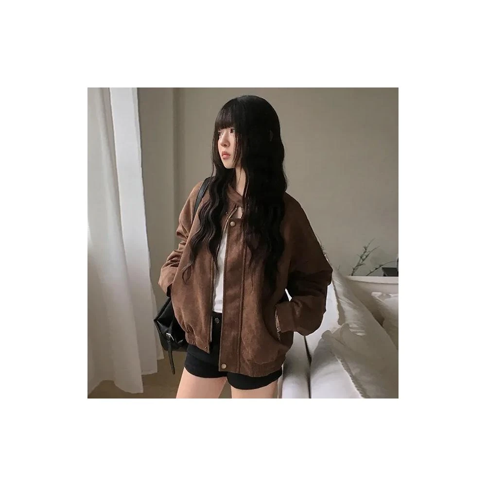 韓系休閒風 麂皮 外套 女生秋冬翻領夾克 寬鬆顯瘦外套 百搭短版麂皮夾克 棕色外套 韓妞 外套