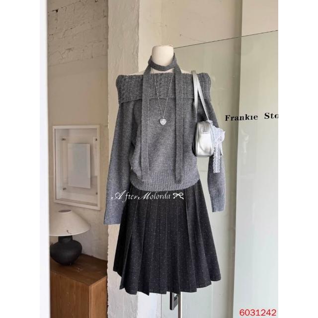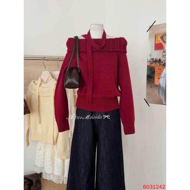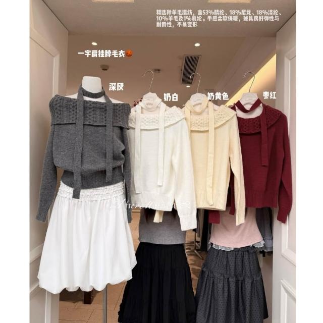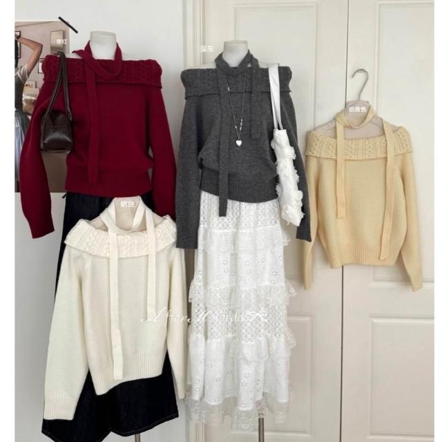 韓系氣質上衣 一字肩掛脖 針織毛衣 一字領 長袖上衣 秋冬保暖針織衫 掛脖設計 顯鎖骨 紅色上衣 綁帶