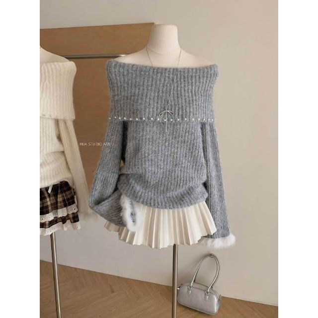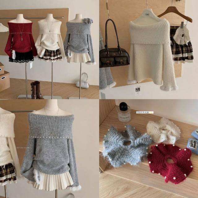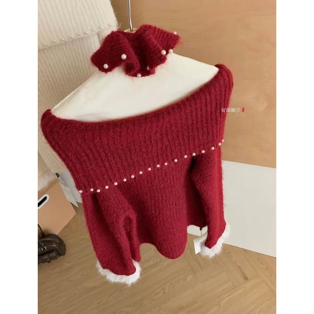 法式一字肩 珍珠 針織毛衣 一字領 紅色 針織上衣 冬季甜美上衣 露肩毛毛袖 上半身顯瘦 氣質上衣