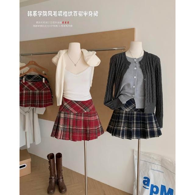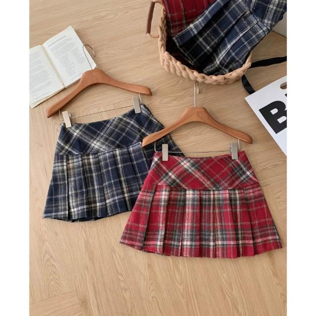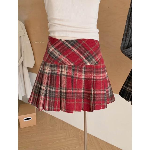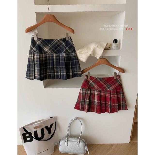 韓系 格子裙 紅色 格紋裙 短裙 褲裙 毛呢裙子 秋冬 聖誕節 韓系 學院感 高腰格紋 百褶裙