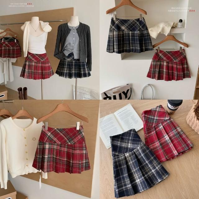 韓系 格子裙 紅色 格紋裙 短裙 褲裙 毛呢裙子 秋冬 聖誕節 韓系 學院感 高腰格紋 百褶裙