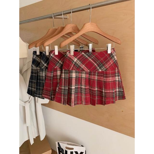 韓系 格子裙 紅色 格紋裙 短裙 褲裙 毛呢裙子 秋冬 聖誕節 韓系 學院感 高腰格紋 百褶裙