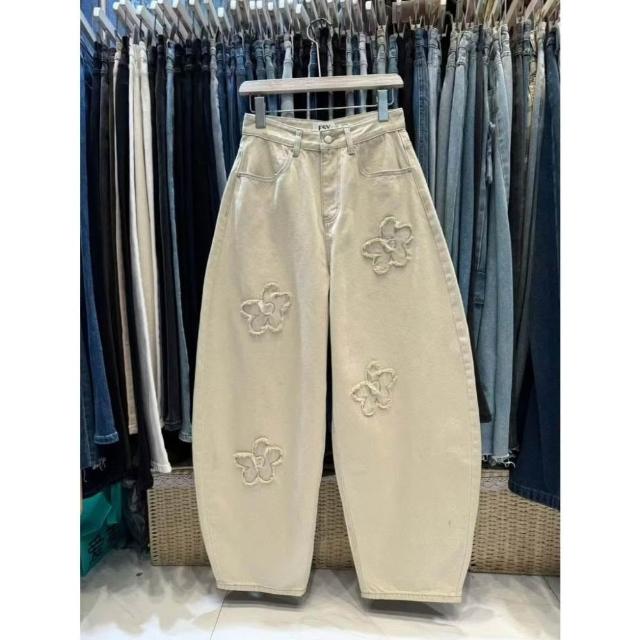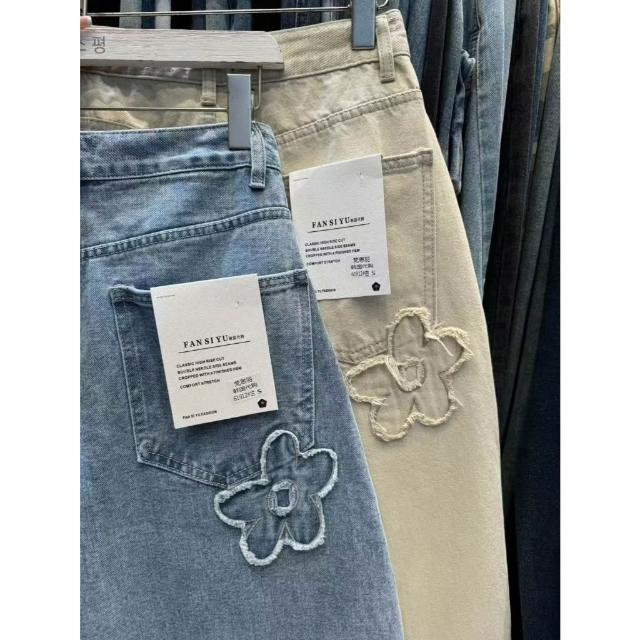 現貨 韓系 刺繡花朵牛仔寬褲 立體 花花 可愛 牛仔褲 牛仔長褲 花朵 彎刀褲 顯瘦 FSY 韓國設計
