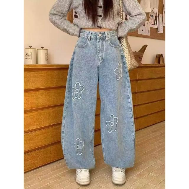 現貨 韓系 刺繡花朵牛仔寬褲 立體 花花 可愛 牛仔褲 牛仔長褲 花朵 彎刀褲 顯瘦 FSY 韓國設計