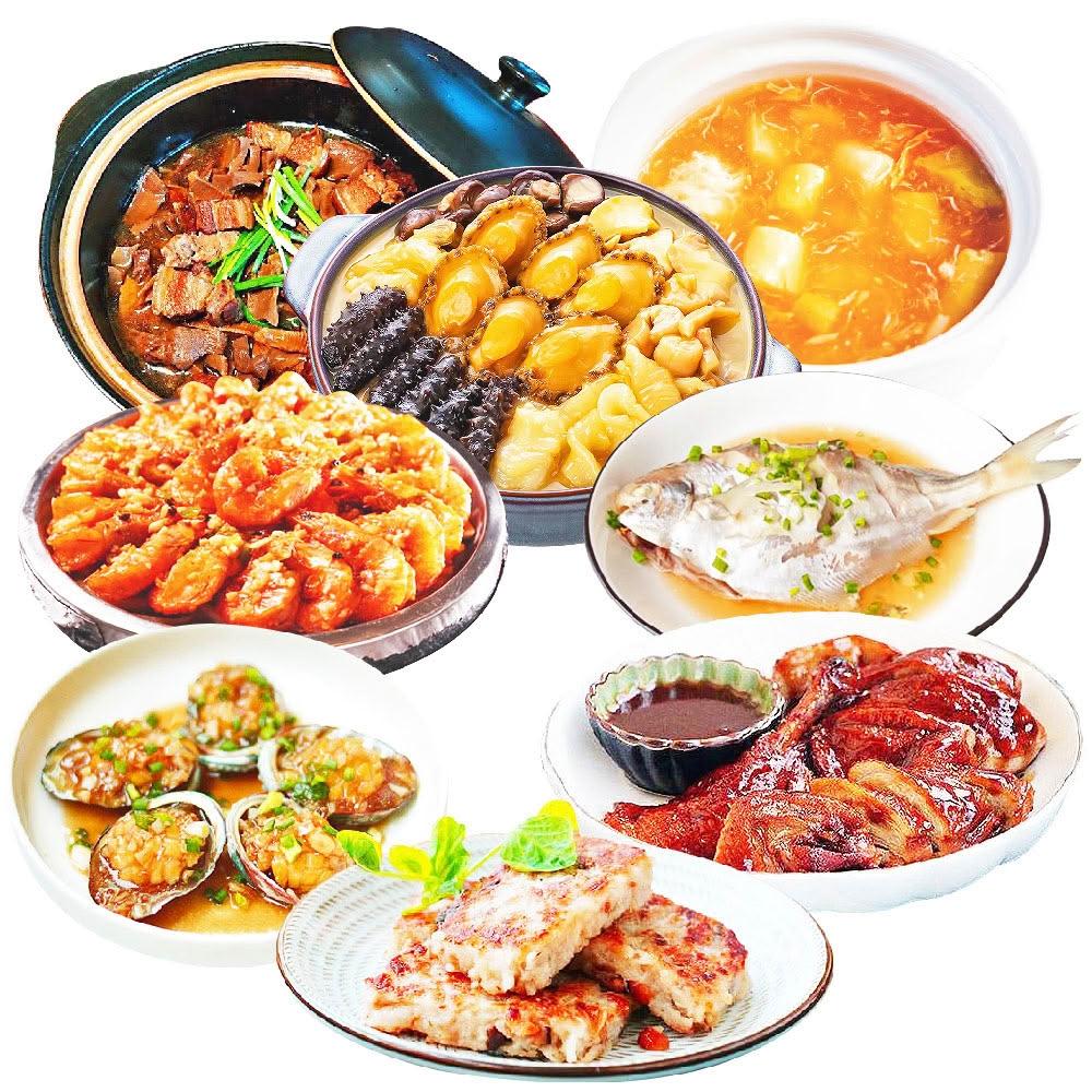 大江生鮮3 年菜組(烏參鮑魚佛跳牆+干貝魚翅海鮮羹+筍絲爌肉+燒鴨+蒜蓉白蝦+蠔汁鮑魚+蘿蔔糕+樹子蒸魚)