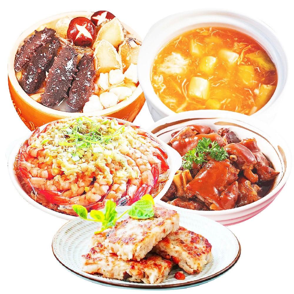 大江生鮮13 年菜組(海參佛跳牆+干貝海鮮羹+蒜泥蒸白蝦+紅燒豬腳圈+干貝蘿蔔糕)