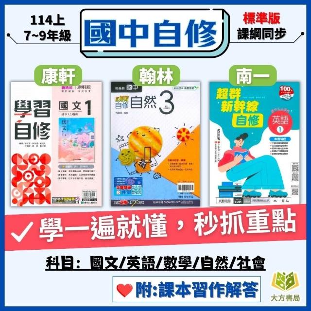 康軒114上 最新版《國中自修》7~9年級 康軒/翰林/南一 國文 英語 數學 自然 社會 附課本習作解答 附解答【大方書局