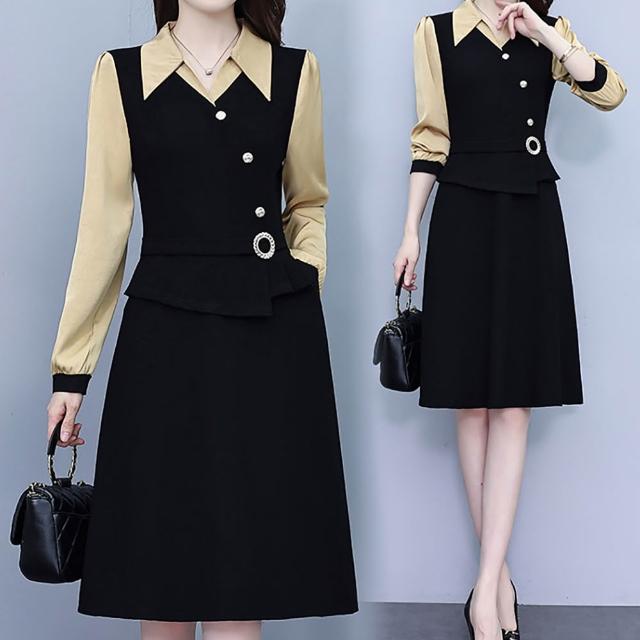 麗質達人5205黑杏色拼接洋裝-LY (L-5XL)