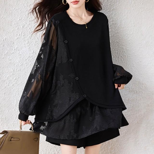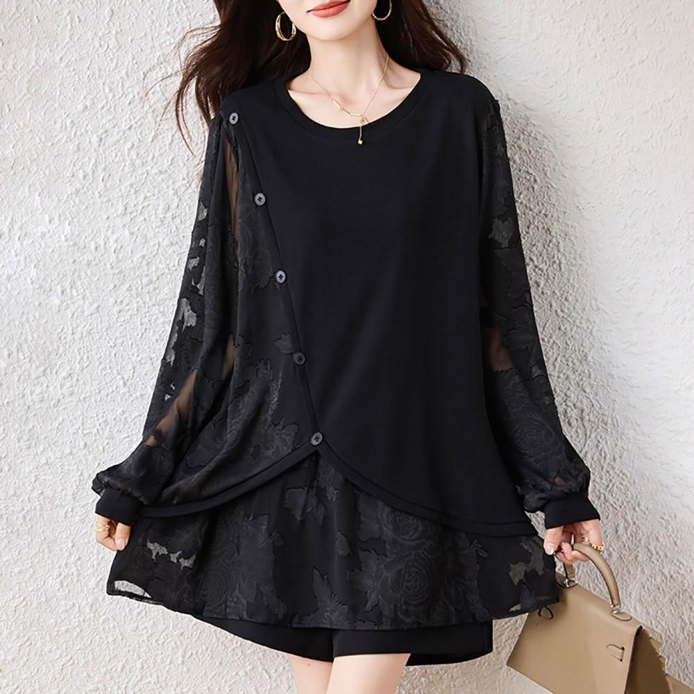 麗質達人9124黑色假二件長袖上衣-LY (L-5XL)
