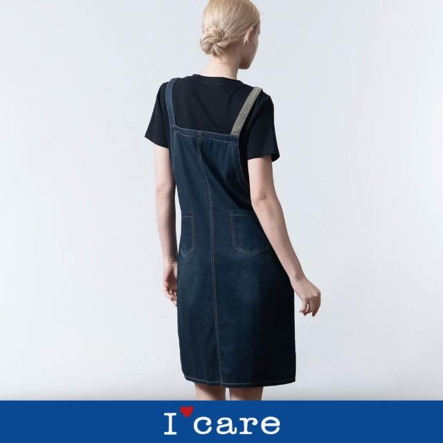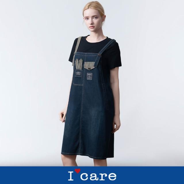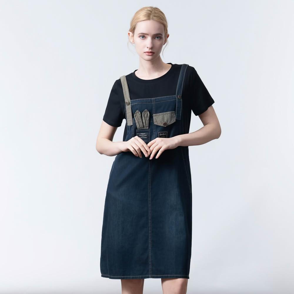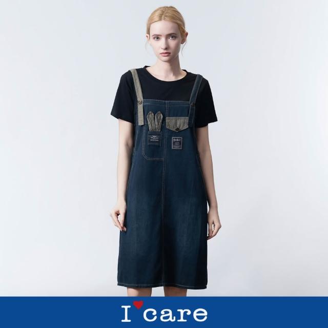 I’Care 依卡現貨-兔耳朵假兩件拼布牛仔吊帶裙(M-L)|休閒洋裝 牛仔洋裝