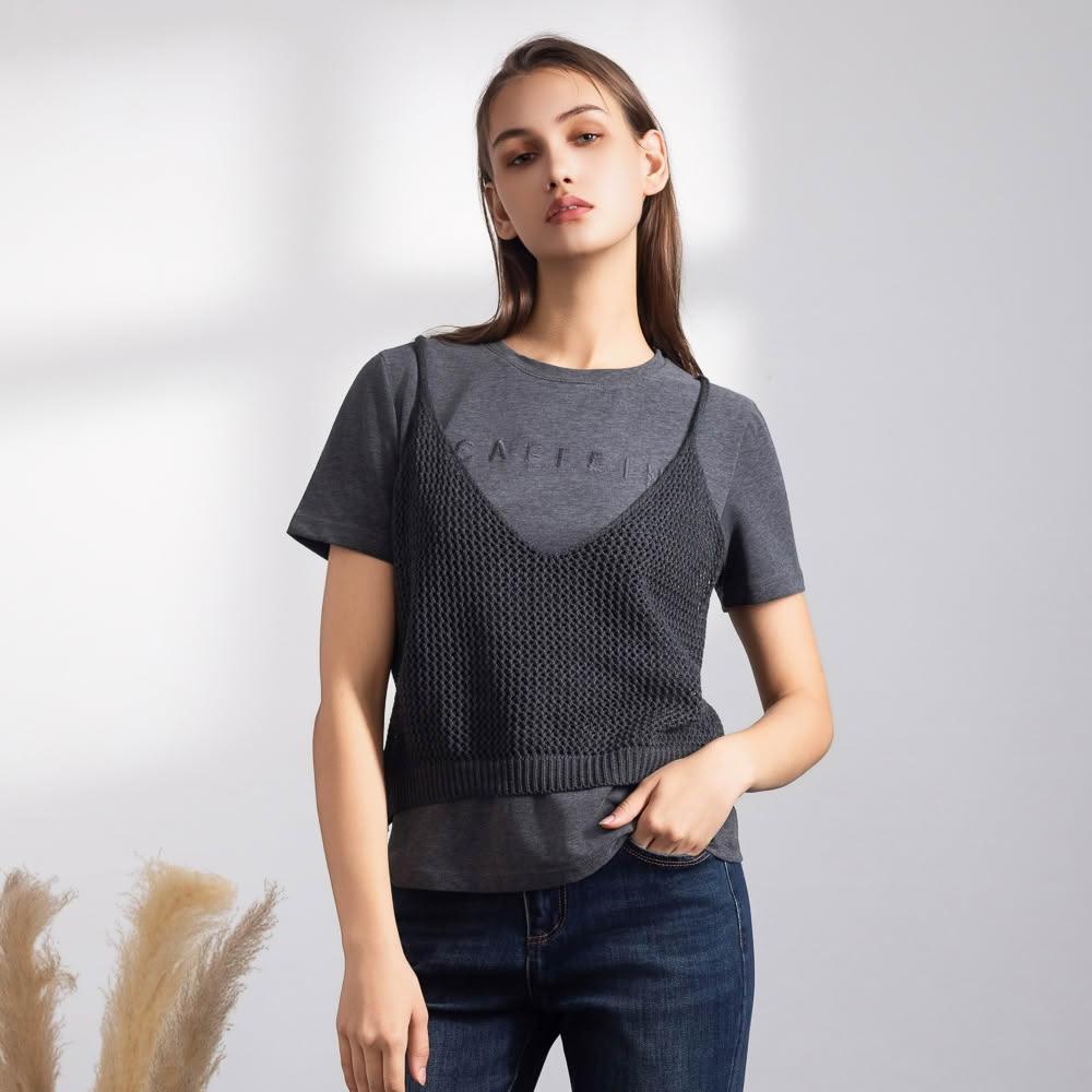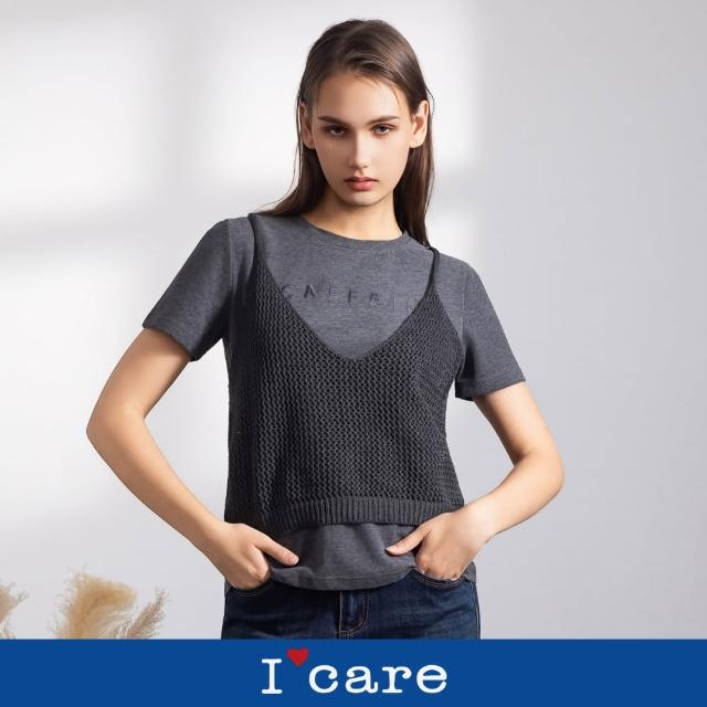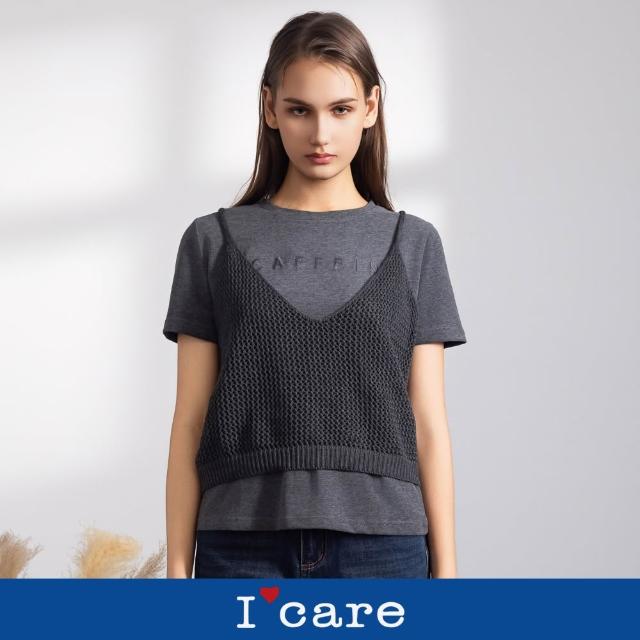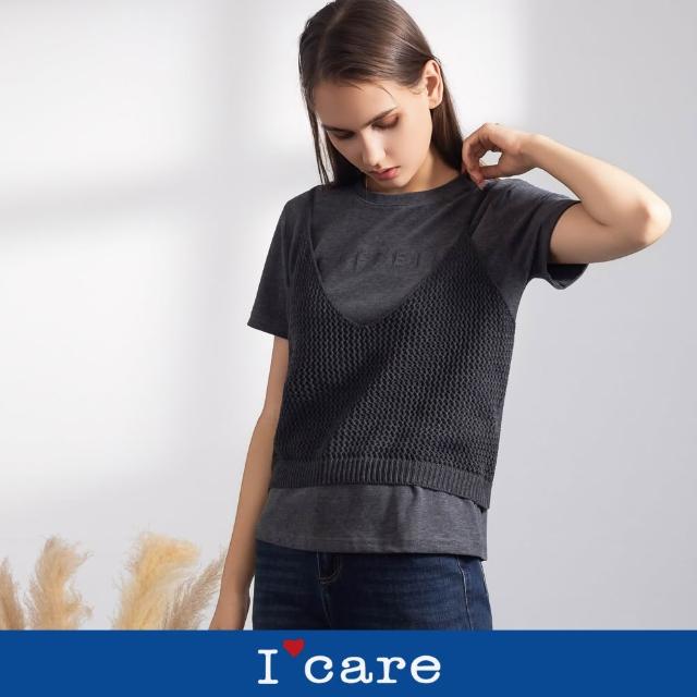 I’Care 依卡現貨-簡約假兩件V領針織背心T恤(F)|女休閒上衣 假兩件 針織背心