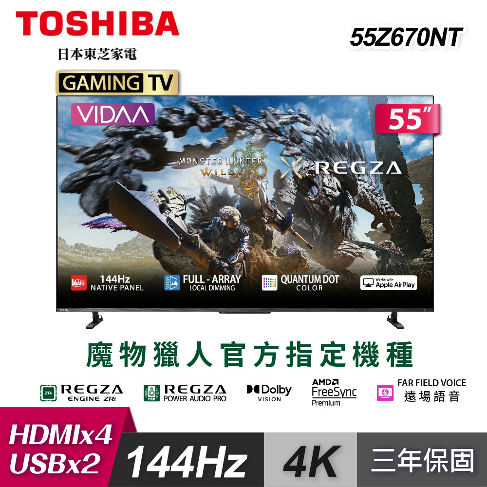 TOSHIBA 東芝55Z670NT 55型 4K QLED 144Hz 智慧顯示器|含壁掛安裝+架子(固定式)