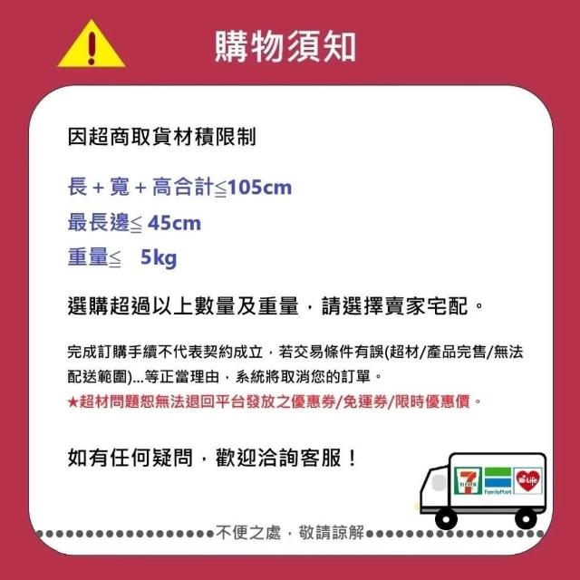 - 針對大型商品(包括:大型家電、家具床墊、健身按摩器材、車類...等),商店將於完成收款確認後,一天內〈不含例假日〉將會有專人與您確認相關配送細節等的聯繫。偏遠地區、樓層費及其它加價費用,皆由商店於約定配送時一併告知,商店將保留出貨與否的權利。