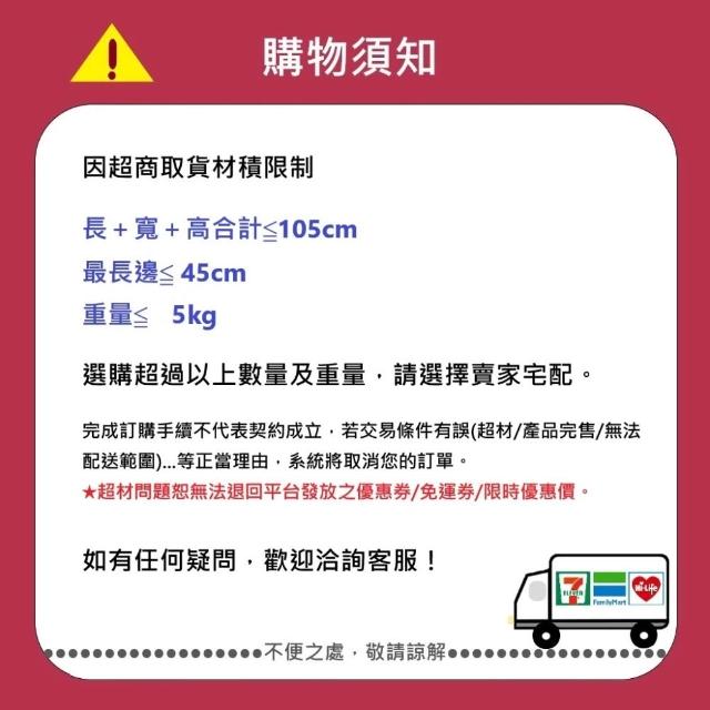 - 針對大型商品(包括:大型家電、家具床墊、健身按摩器材、車類...等),商店將於完成收款確認後,一天內〈不含例假日〉將會有專人與您確認相關配送細節等的聯繫。偏遠地區、樓層費及其它加價費用,皆由商店於約定配送時一併告知,商店將保留出貨與否的權利。