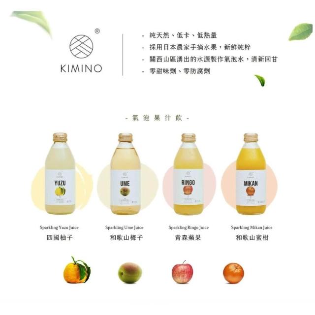 日本 KIMINO Drinks 氣泡果汁飲 250ml x4入組 氣泡飲 果汁 無酒精 柚子 蜜柑 梅子 白桃 蘋果