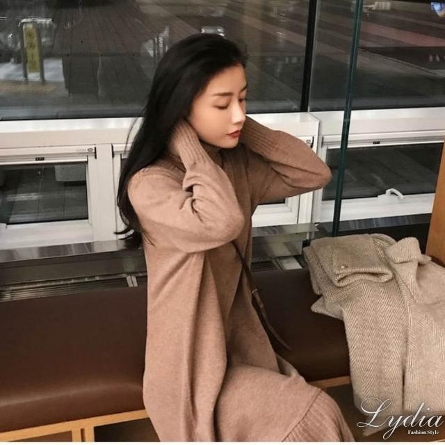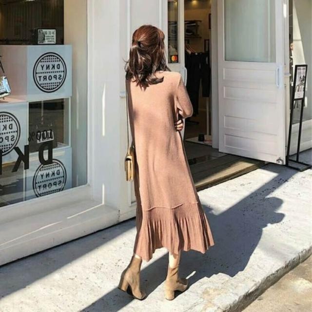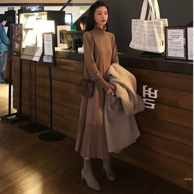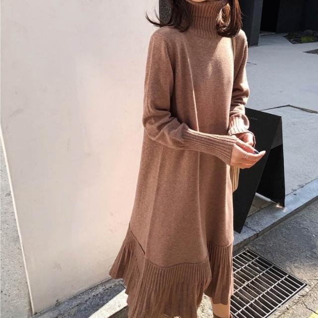 Lydia貨 連身洋裝 秋冬新款高領百褶拼接裙擺設計長洋裝-咖色#1001245