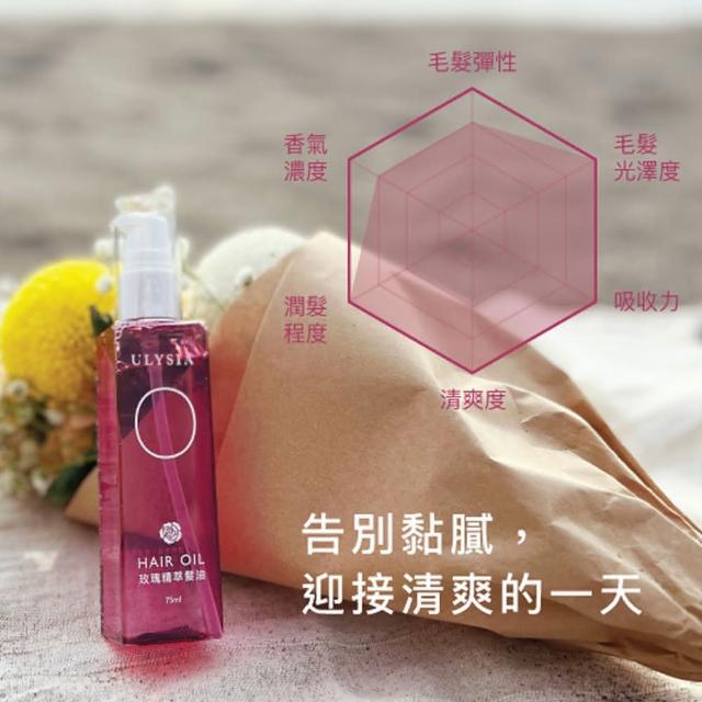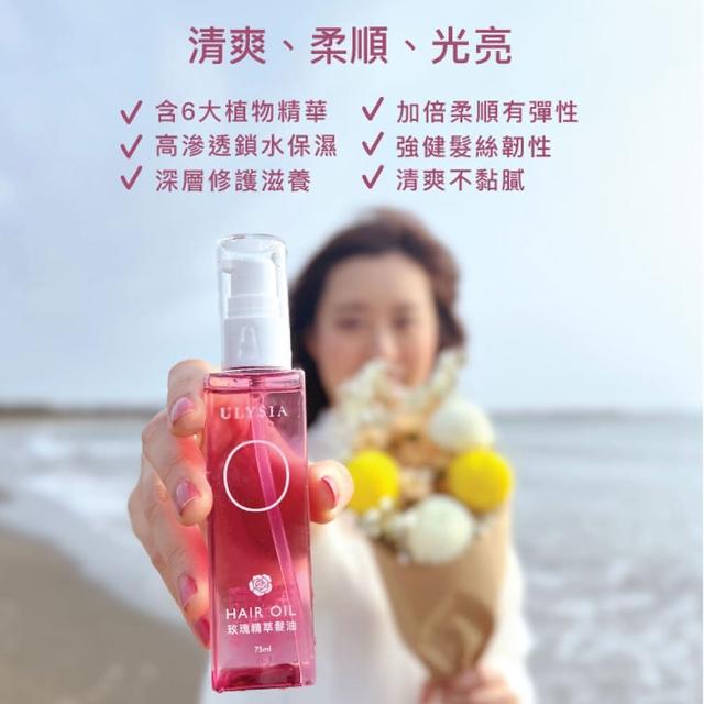 ULYSIA歐麗雅 玫瑰精萃髮油75ml 6種大自然珍貴的花果提鍊而成的精油和養分 高滲透鎖水保濕 強健髮絲 深層修護滋養 補充毛髮應有油脂 加倍柔順有彈性 清爽不油膩 台灣製