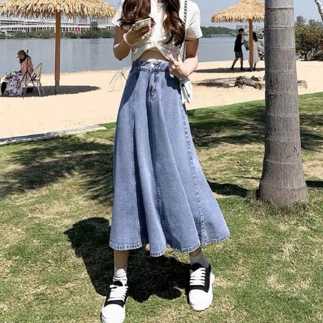 JDUDS復古高腰中長款牛仔裙 A字牛仔裙 高腰顯瘦傘裙 長裙 女裝 裙裝