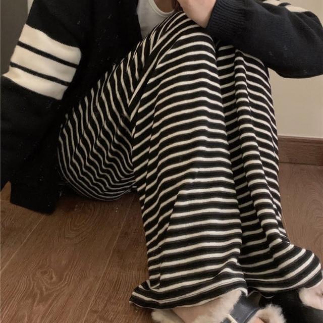 JDUDS黑白條紋闊腿褲 垂感溜灣褲 慵懶風格落地褲 黑白條紋長褲 黑白條紋寬鬆褲 綁繩褲 女生長褲